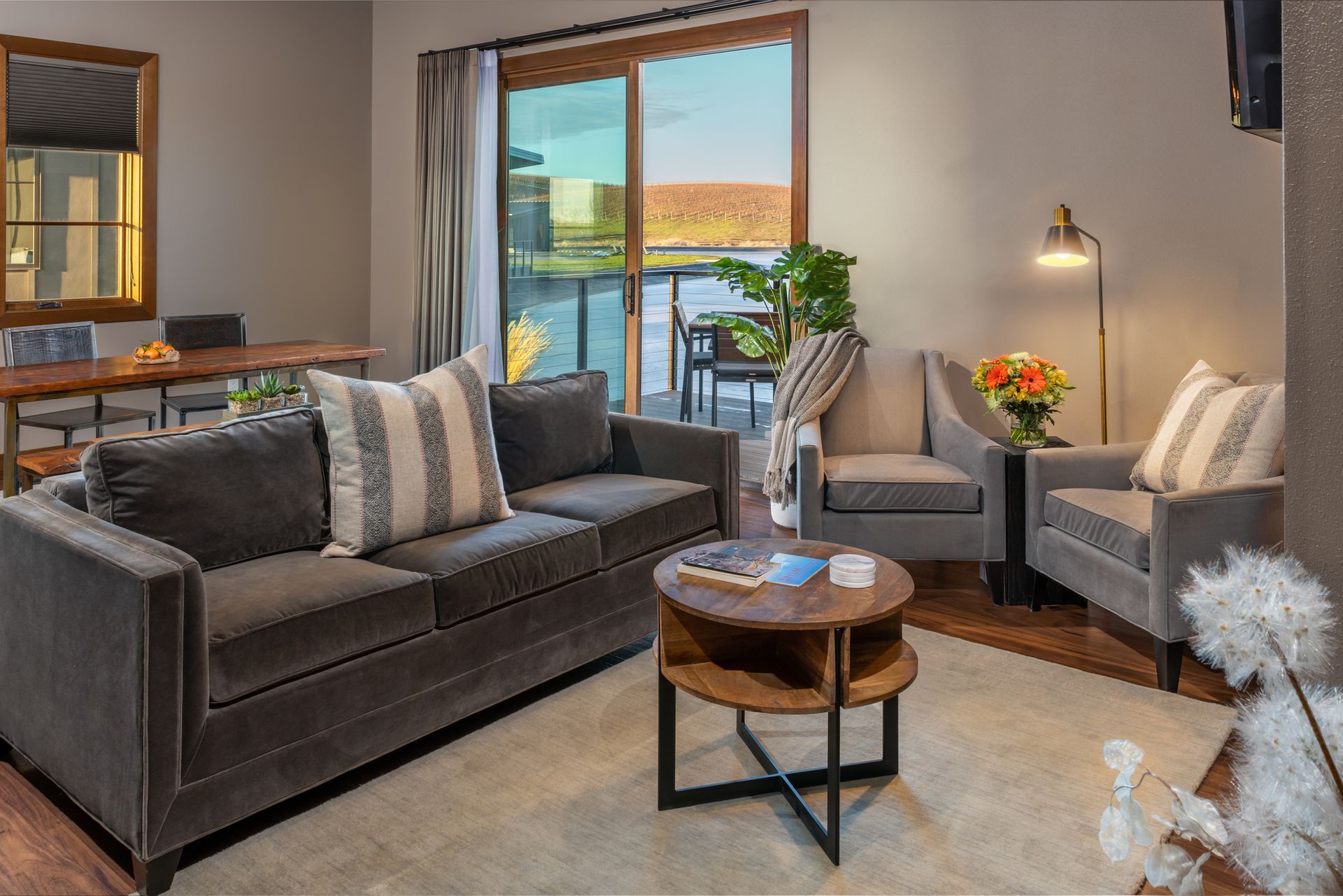 Each suite and bungalow is designed to capture the sweeping views surrounding the resort. Walls of windows and a patio or deck open to the vineyards, wheat fields, Lake Sienna or the Blue Mountains.
